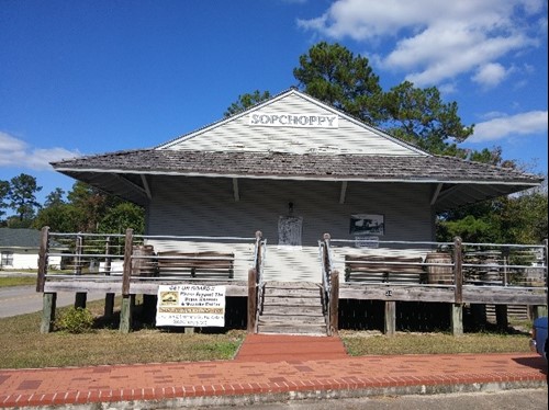 The Sopchoppy Depot is a historic railroad warehouse and depot located within the historic downtown of Sopchoppy. Built in 1894 as a stop along the Carrabelle, Tallahassee, and Georgia Railroad, the Sopchoppy Depot was a centerpiece of the town as it was originally laid out. The depot was in active use until 1946, and today serves as a museum of local history. The Sopchoppy Depot, like many contemporary train depots, was instrumental in the development of its community, easing the transportation of goods and people.