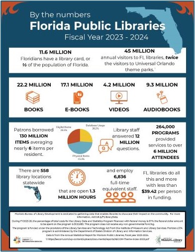 Our latest data display highlights the significant contributions Florida's public libraries make to their communities. Did you know that in fiscal year 2023-24, 45 million people visited our state's public libraries? That's twice the number of visitors to Universal Orlando theme parks.